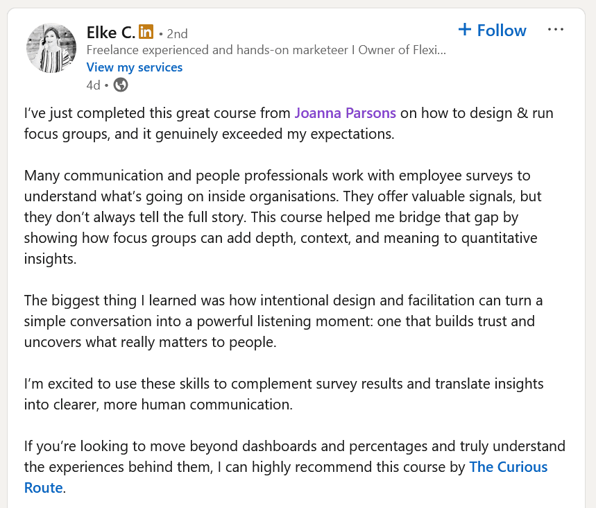 If you’ve never run a focus group before (or you have but want to get better at them), my new course will teach you everything you need to know. I’m a sociologist by training and I’ve run hundreds of focus groups throughout my career and this course is packed with practical, step-by-step guidance on how to design, facilitate and analyse focus groups so you can gather the kind of insights that make leaders sit up and listen.