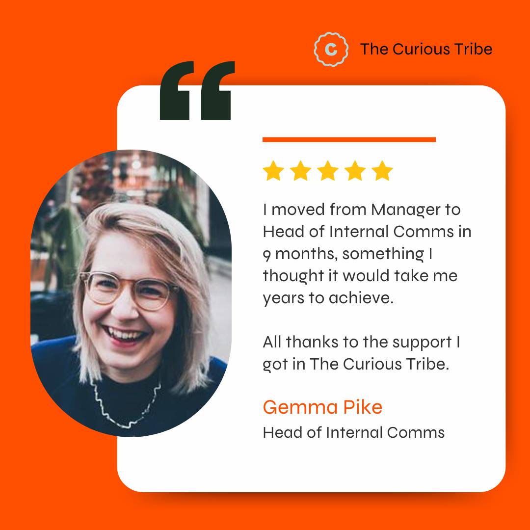 Gemma is now Head of Internal Communications at Global Witness. And she’s still a member of The Curious Tribe so she can keep growing with a tribe of supportive peers by her side. The Curious Tribe is my membership community for ambitious, curious internal comms pros who want to achieve more in their career and have more impact in their job.