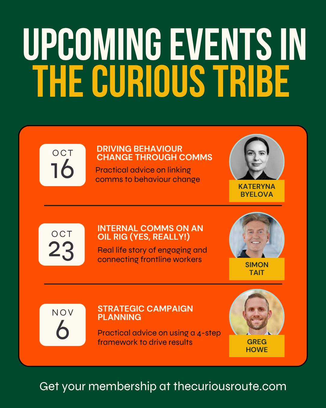 ​The Curious Tribe is a premium membership community for ambitious internal communicators who want to transform from tactical order-takers to strategic advisors, all while connecting with peers who understand the real challenges of internal comms.