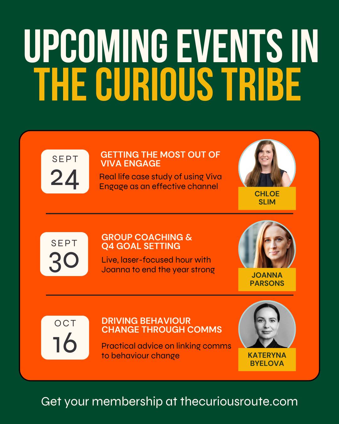The Curious Tribe is a premium membership community for ambitious internal communicators who want to transform into strategic partners who are valued and respected for their expertise, all while connecting with peers who get it.